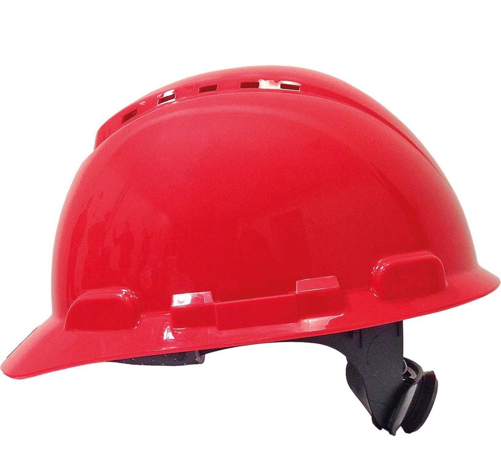 Czerwony kask ochronny Consorte VANDAL-V – wykonany z HDPE, z regulacją na tył głowy, wyposażony w mocowania na osprzęt. Spełnia normę EN 397 i posiada certyfikat CE – idealny wybór dla prac budowlanych i przemysłowych.
